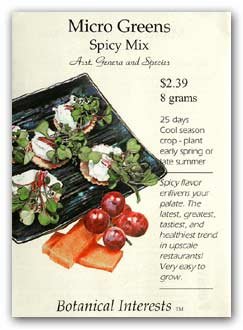 Micro greens are popular in gourmet restaurants, and are great at home for adding a fresh flavor to almost any dish. The spicy mix includes Peppergrass Cress, Radish China Rose, Cabbage Red Ace, Sawtooth Mustard, and Mustard Red Giant. These greens are easy to grow, even inside over the winter! The seed comes in an 8 gram seed package.