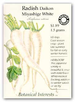 The Daikon Miyashige White Radish is a Japanese radish variety. This white root has a great flavor and is wonderful in salads and stir-fry. It works well as a fall crop. This certified organic seed comes in a 1.5 gram package, which is about 55 radishes after thinning.